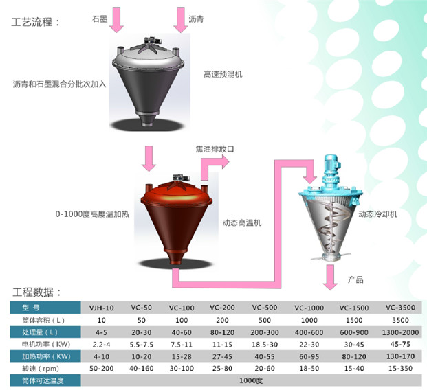 VJH高溫包覆改性機(jī)是我公司結(jié)合國(guó)外先進(jìn)技術(shù)最新研發(fā)的混合設(shè)備,提高混合效率,使顆粒能充分的混合和分散,并能達(dá)到微米級(jí)混合均勻的混合機(jī)。它具有廣泛的用途,如料費(fèi)、液體和粉料的強(qiáng)混合球型化、分散、破碎、干燥、造粒和包覆等功能。通過轉(zhuǎn)軸的速度產(chǎn)生離心力將產(chǎn)品推向混合腔體內(nèi)壁。此時(shí)腔體的錐形形狀及刀片的形狀使產(chǎn)品產(chǎn)生一個(gè)沿內(nèi)壁向 上的運(yùn)動(dòng)。產(chǎn)品再由特別設(shè)計(jì)的混合機(jī)蓋引導(dǎo)到混合機(jī)的中心,并回落到混合腔的底部,重新開始新一輪的混合過程。 桶壁隔套有加熱源,熱量通過簡(jiǎn)壁傳遞到桶內(nèi),通過攪拌刀片的運(yùn)行將熱量經(jīng)由物料向簡(jiǎn)體各個(gè)角落輸送,由于刀片的不同角度設(shè)計(jì),使得物料在桶內(nèi)均勻被加熱,包覆,改性。